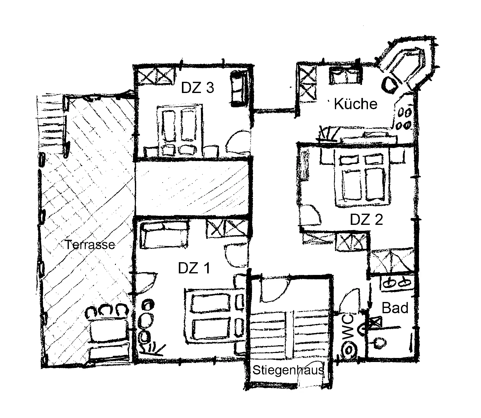 Das 75 m² große Schneeflöckchen Appartement 1 befindet sich im Erdgeschoss unseres Wohnhauses und verfügt über 3 Schlafzimmer mit jeweils einem Doppelbett.